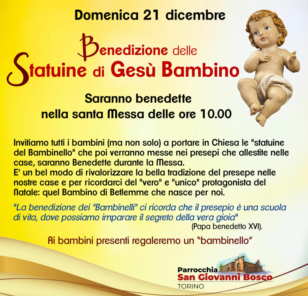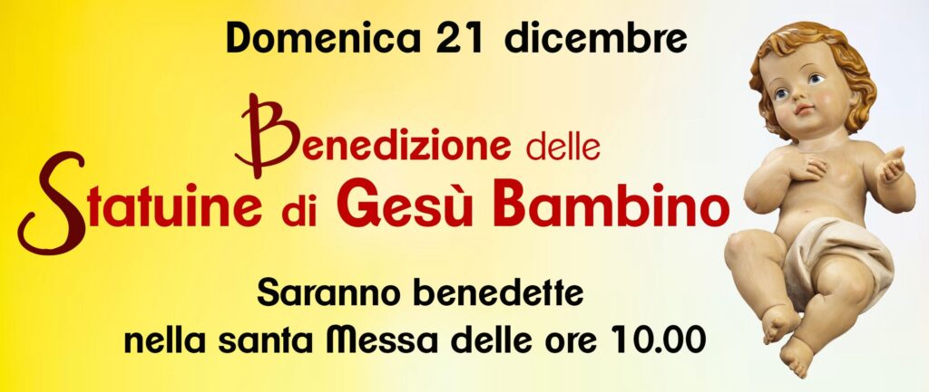 Invitiamo tutti i bambini (ma non solo) a portare in Chiesa le “statuine del Bambinello” che poi verranno messe nei presepi che allestite nelle case, saranno Benedette durante la Messa. E’ un bel modo di rivalorizzare la bella tradizione del presepe nelle nostre case e per ricordarci del “vero” e “unico” protagonista del Natale: quel Bambino di Betlemme che nasce per noi.