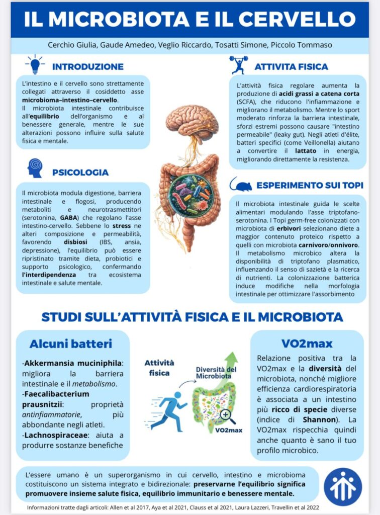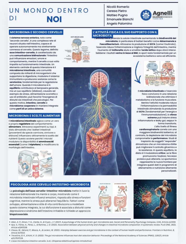 Nelle scorse settimane, la classe 4ª Liceo B ha svolto un’attività di ricerca nell’ambito della biologia dedicata alle interazioni tra sport, dieta e microbiota intestinale, con l’obiettivo di comprendere come questi fattori influenzino il benessere psicofisico e la performance sportiva.